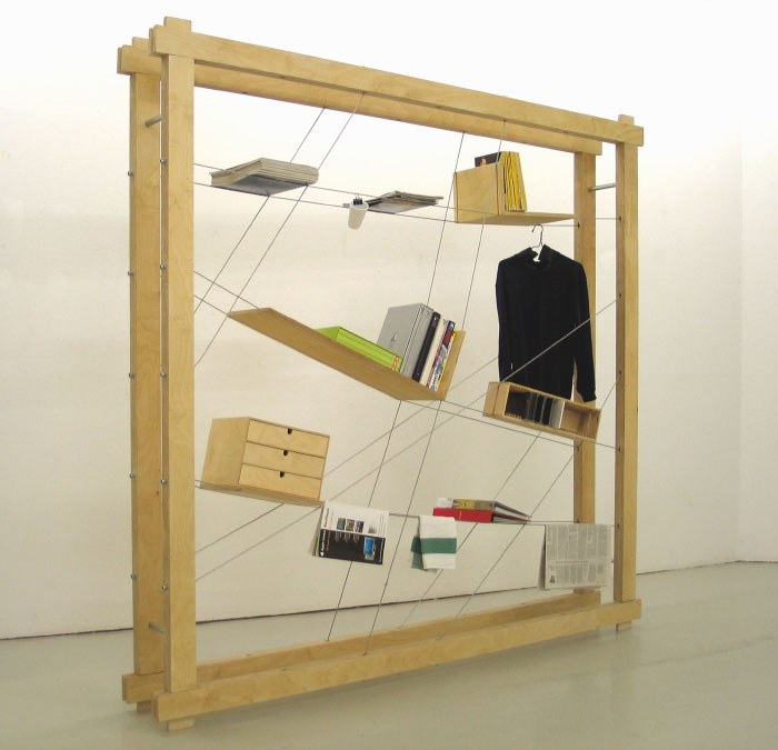 La libreria occupa visivamente pochissimo spazio, sfida l’utente a riordinarla creativamente e agisce come un collettore per tutte quelle cose che sono sparse disordinatamente in giro.