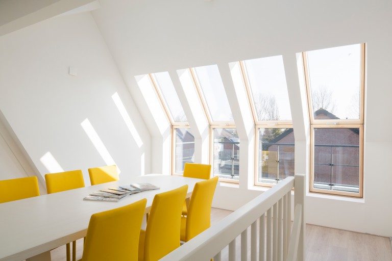 Per creare una spaziosa camera da letto con bagno privato, dedicata ai proprietari, il progettista ha avuto l’idea di includere delle finestre per tetti VELUX per creare una parete vetrata.